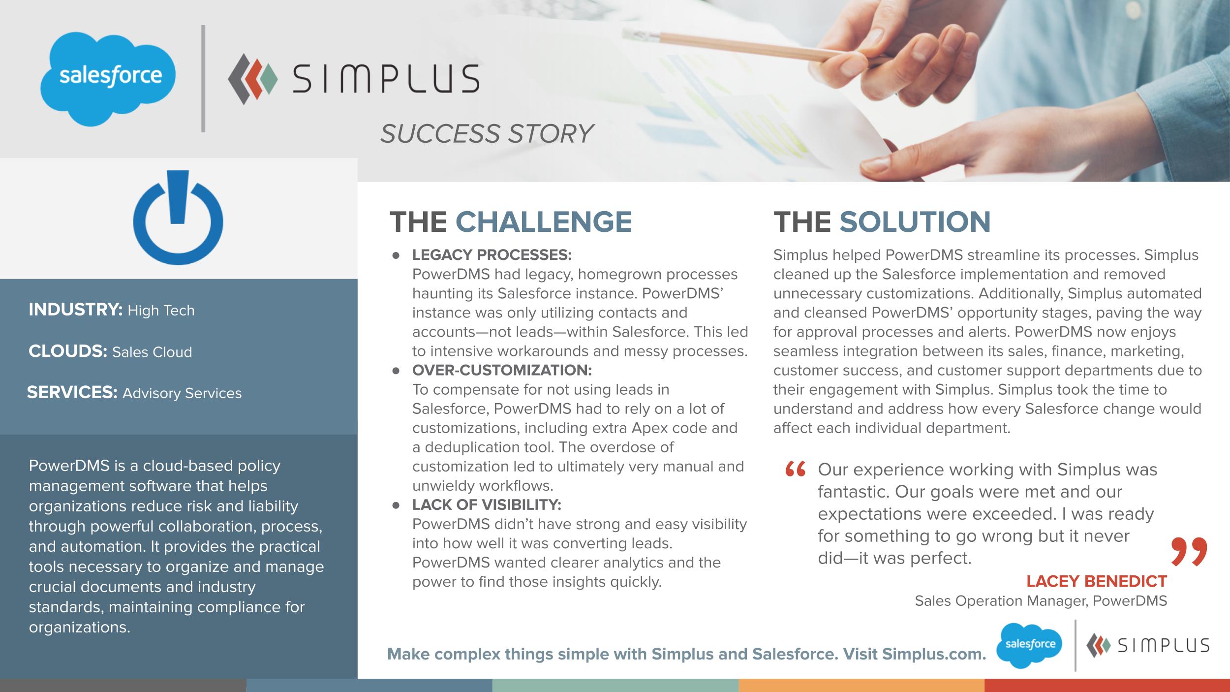 When legacy processes and overly customized workarounds start to take over, it’s time for a change. PowerDMS, a cloud-based policy management software provider, was experiencing the lack of visibility and time-consuming manual effort that comes with an unwieldy Salesforce instance. Simplus Advisory Services created the roadmap out and paved the way to a more seamless Salesforce experience at PowerDMS.