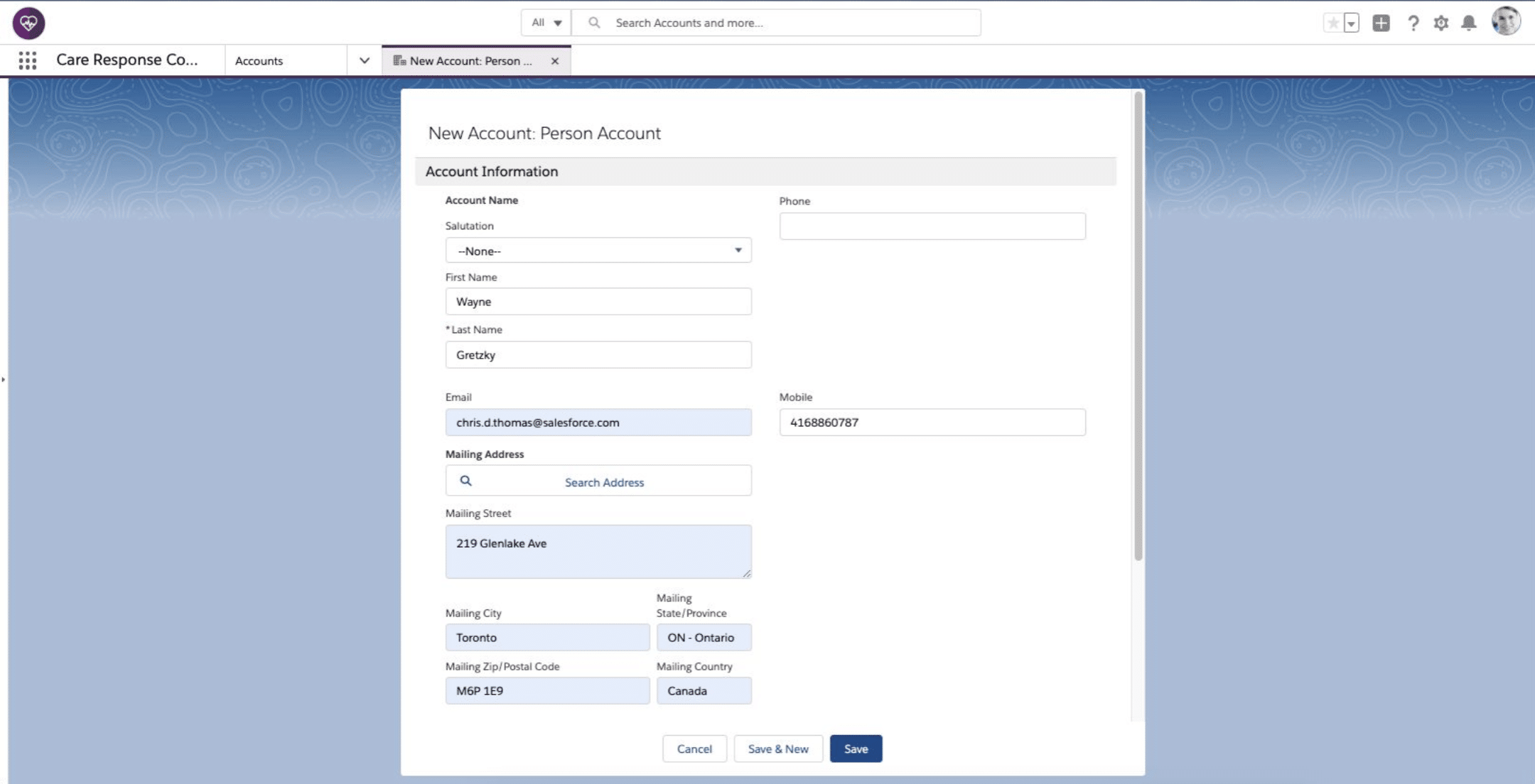 3. Here’s a look at an example person account object within the Care Response Console in Salesforce. Personal information, contact information, and related activity are all associated with the account.