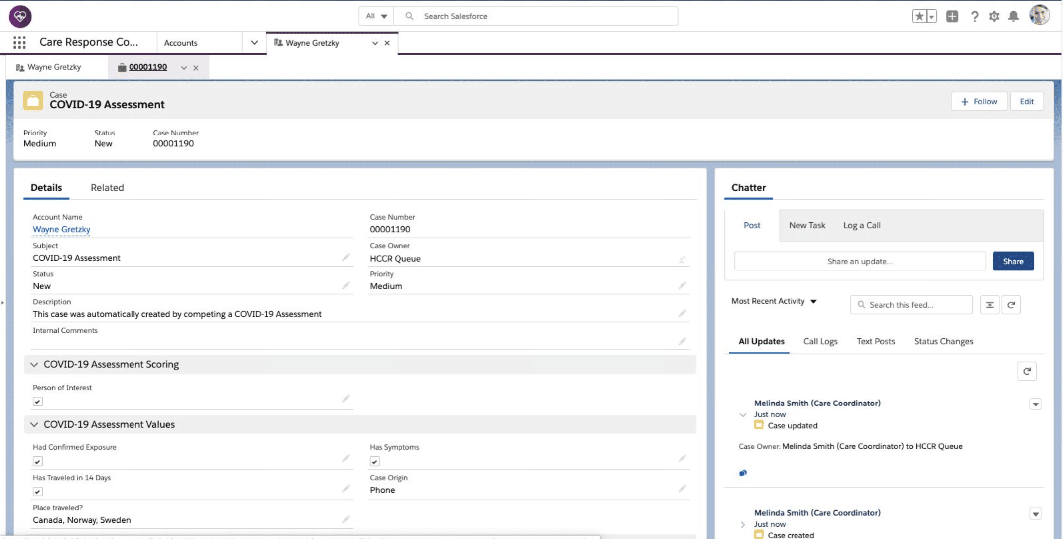 5. Once complete, the assessment will be logged as a case object under the patient’s person account. Multiple cases can be created as need demands.